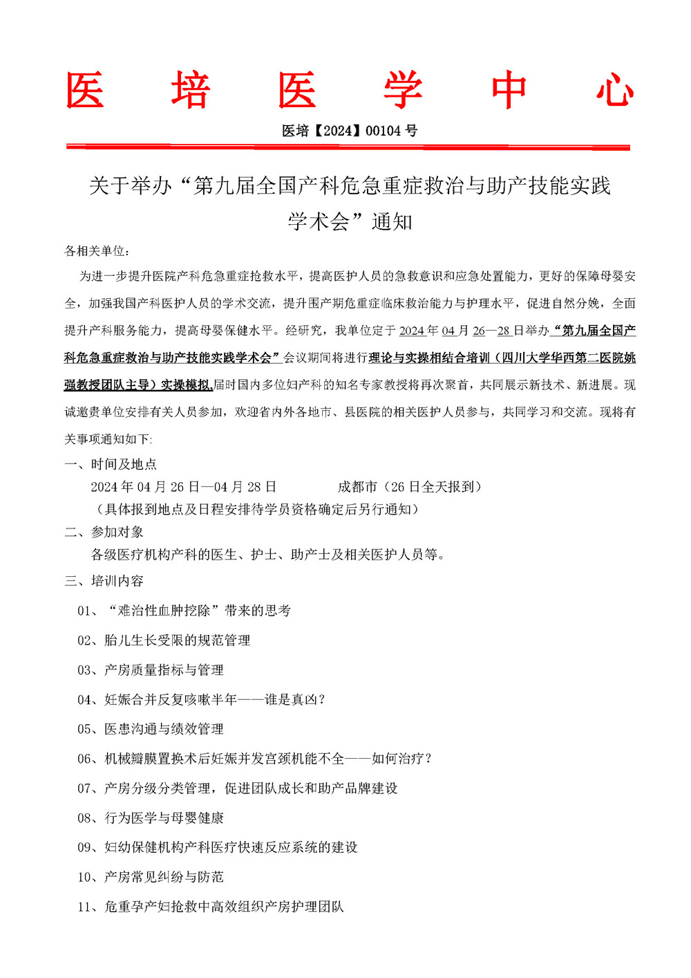 关于举办“第九届全国产科危急重症救治与助产技能实践 学术会”通知